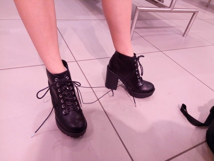 блин, у меня в 7-8? классе были подобные ботильоны- такие же каблуки и подошва-платформа грубая, и шнурки. И косуха!