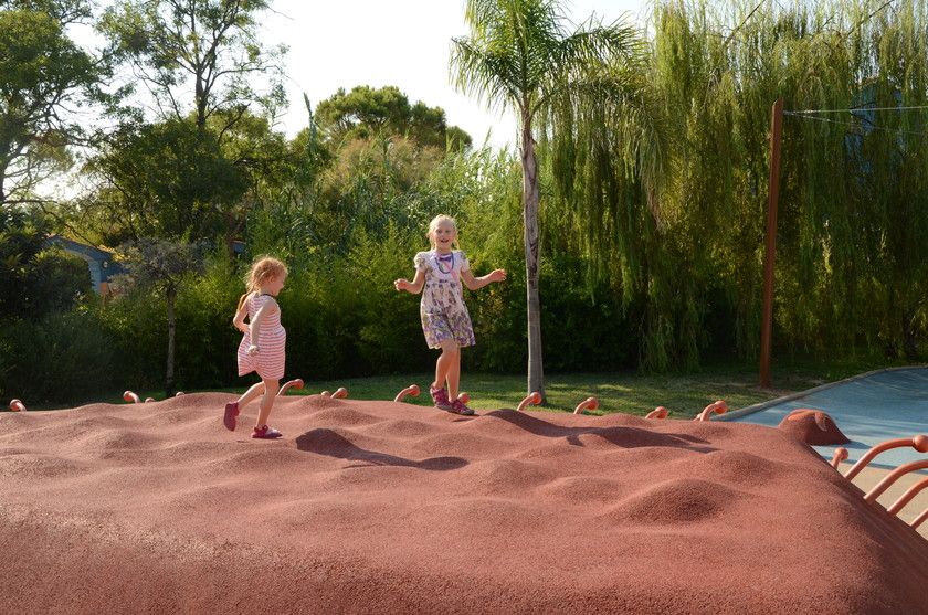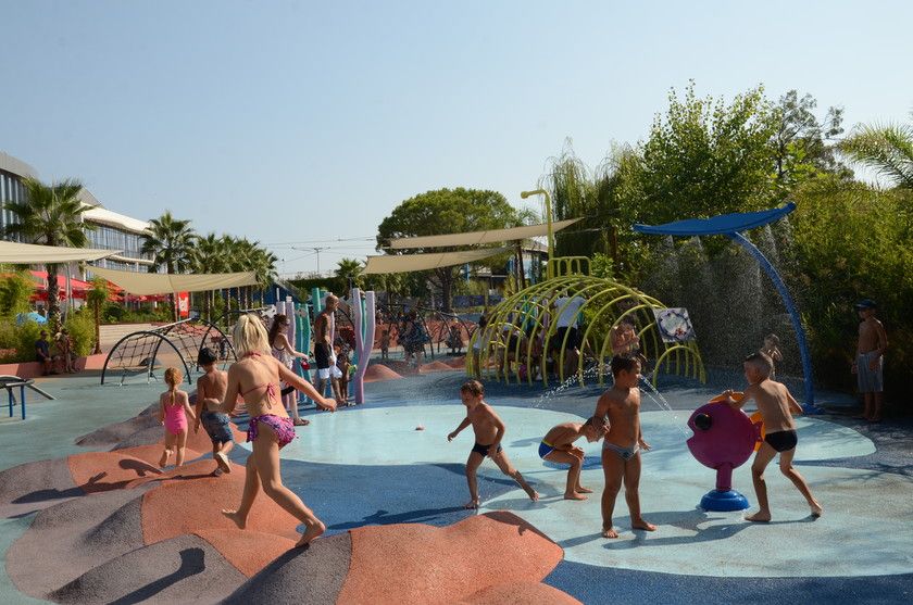 На территории несколько детских площадок.Одна оборудована поливалками, там дети спасаются уже от жары.