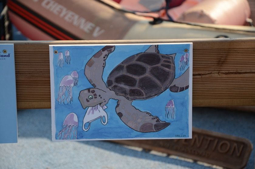 Естественно, затрагивается тема экологии.Пришла счастливая семья на пляж, в кульке принесли бутерброды, напитки.Ветер унёс кулёк в море, там его увидела черепаха и подумала, что это медуза и решила съесть.