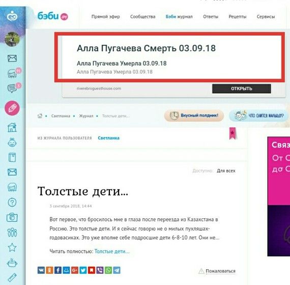 На рекламу внимания не обращаю, но пару недель назад бросился в глаза заголовок о смерти Пугачевой. И теперь невольно стала обращать внимание на это. Оказывется, она ежедневно умирает на моей странице, никакого разнообразия, и эта траурная нота уже напрягает?!У вас тоже Пугачева в некрологе или может кто другой?