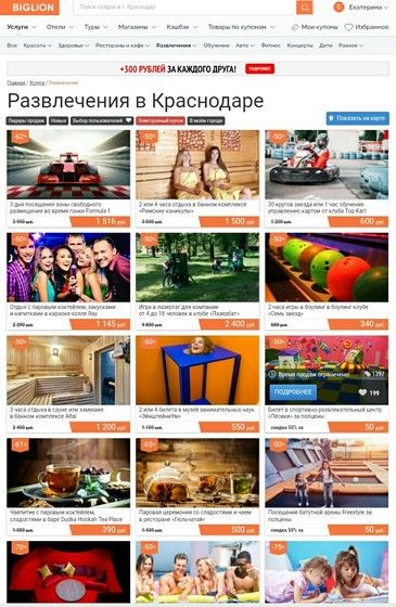 В наш городишко Биглион зашёл лет 7 назад. А моя московская приятельница угощали меня штруделями с 50% скидкой в Москве в кафе еще лет 9 назад. Ну так вот. Я Чего только не испробовала в энтом биглионе. Самое популярное для меня было — это скидки в салоны, ну там, окрашивание, стрижка, массаж даже китайский… Красили меня в основном неумёхи или начинающие мастера, которым нужна клиентура. Салон или мастер профи никогда не пойдет на такую копеечную оплату своего труда. Им остается всего лишь 25% от заявленной суммы. Можно урвать реальную скидку на билеты в театры, путешествия, кафе-рестораны. Попробуй не с натяжного потолка, а ужина в кафе на двоих. Или купи скидку 50% в контактный зоопарк, например. Сравни с реальными ценами заранее. Они все очччень любят поставить 200% и скинуть 80%. Удачи!