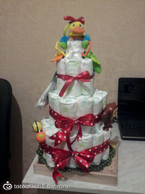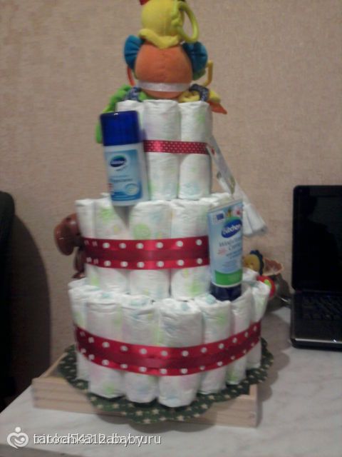 Угу — из подгузников + кремушек, шампунька или мыло жидкое+ погремушки-игрушки )) очень прикольно смотрится