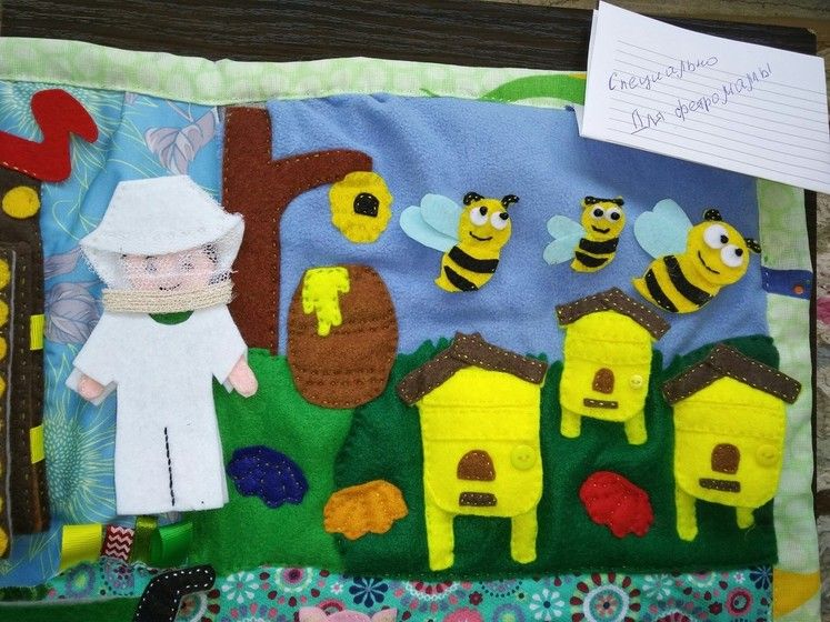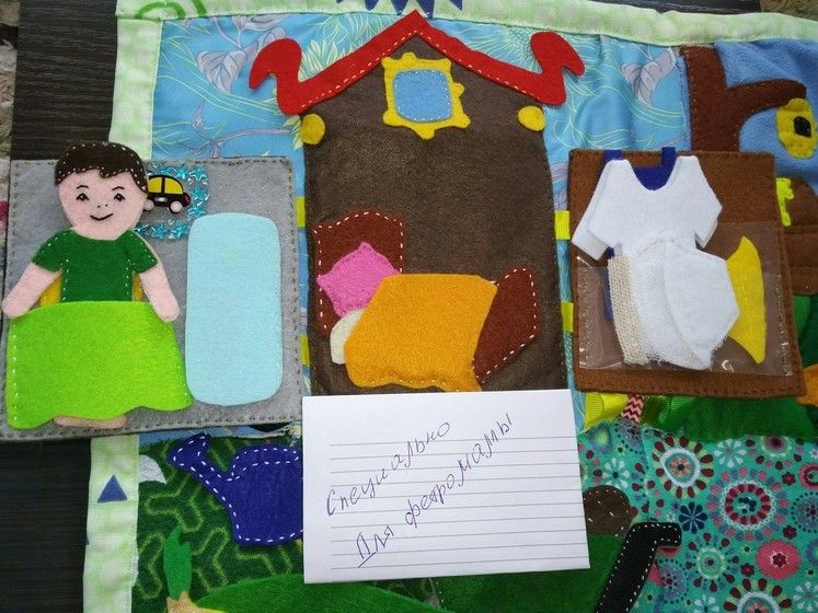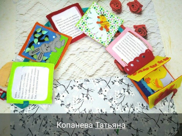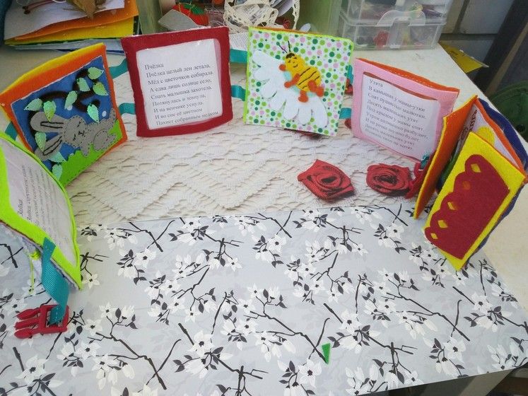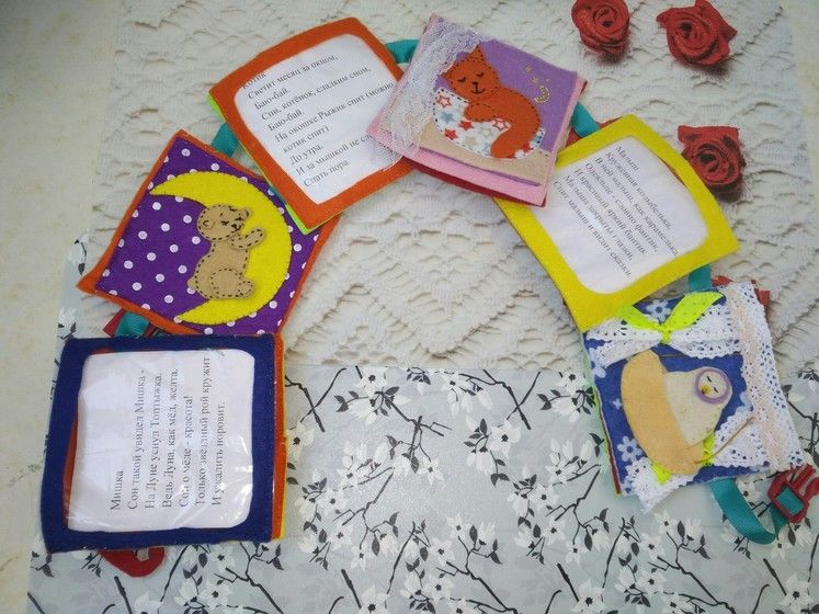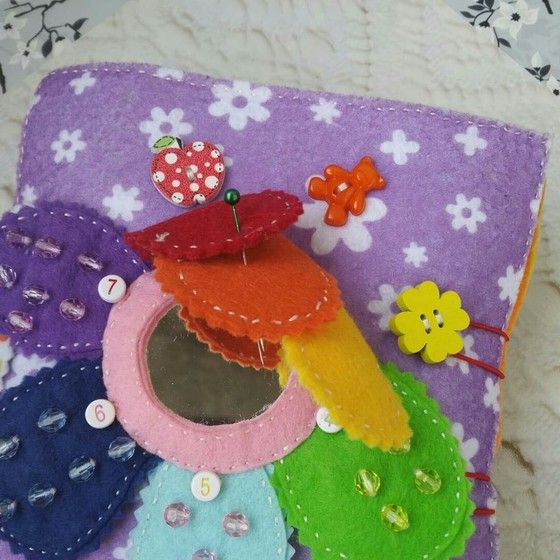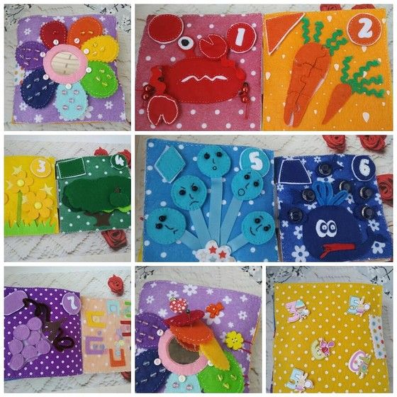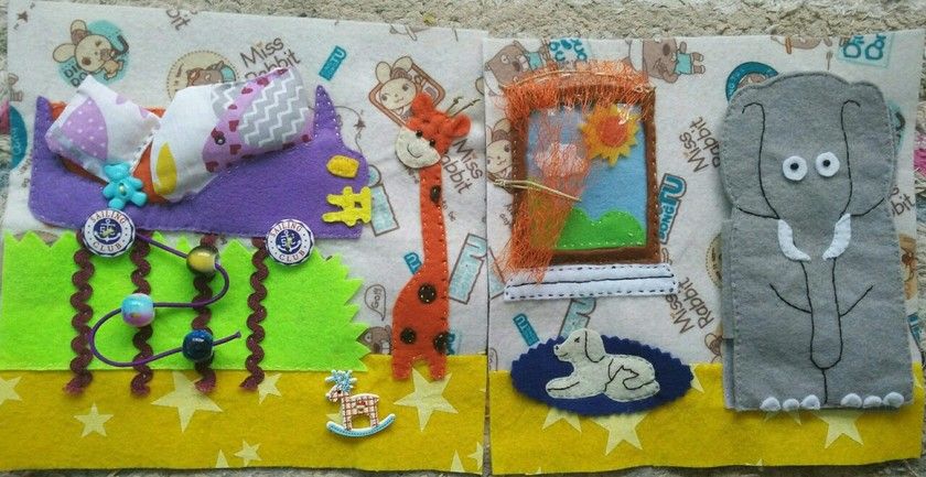 Я применяю в работе с детьми и свои дети отлично играют, разные пуговки, замочки, застежки, крючки, липучки. В книжке малышке маленькие стишки для засыпания и героев можно потеребить.