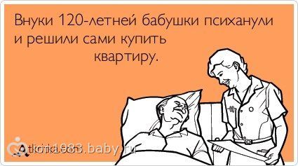 Мама созрела разменивать бабулину квартиру (у нее огромная двушка, продав ее хватит и на однушку небольшую бабуле, и на хорошую двушку в стройке мне), но бабуля заорканилась и ни в какую… у нее там друзья хачики живут и эти говнюки (черные риэлторы) ходят все ей на мозги капают, чаек с ней попивают, да водочку, хорошо что они с мамой друг без друга ничегошеньки не могут с этой квартирой сделать, а то уже пропила бы давно ее… Еще есть брат, которому мы при странных обстоятельствах уступили свою квартиру, он ее здает, а сам живет на даче… Еще есть свекры у которых трешка на двоих и ее тоже можно было бы очень выгодно продать, еще есть двушка моих родителей, точнее моя и папина, которую можно так охрененно продать, что еще на 5 квартир хватит (грубо говоря)=)))) Еще есть бабушка крестная мужа, у которой большая двушка, опять же… Это только те варианты, которые могли бы нам помочь, но всем же плевать с высокой колокольни=))) Все только нам сочувствуют и все=))))