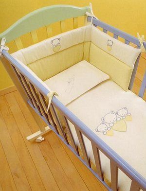 В «экипировку» кроватки обязательно входит постельное бельё. Для детей оно шьётся из натуральных хлопчатобумажных тканей: бязь, ситец, сатин. Постельное бельё продаётся в комплекте и по отдельности. Вполне достаточно купить два комплекта (стоят они от 200 руб.), проверив соответствие всех его предметов размерам имеющихся постельных принадлежностей.