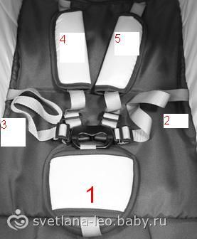 Ремень 1 на конце имеет застежку, куда вставляются ремни 2 и 3. Ремни 4 и 5 надеваются на зубчики ремней 2 и 3. Таким образом можно либо трехточечно застегнуть (1-2-3) либо пятиточечно (1-2-3-4-5).