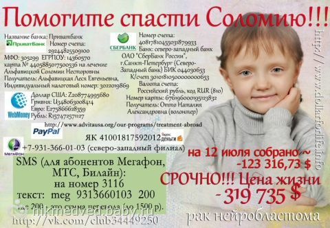 Мы просим всех, кто может оказать посильную помощь, независимо от страны, от того, где Вы находитесь, просим Вас помочь Солечке!!! ПОМОГИТЕ ДЕВОЧКЕ ЖИТЬ!!! СПАСИБО ВАМ!!!