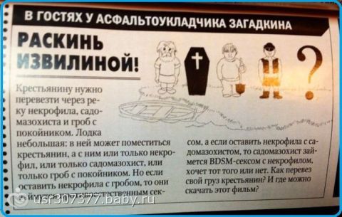 Переправить некрофила, приплыть за гробом, переправить гроб, забрать некрофила — переправить его обратно, забрать садомазохиста, переправить к гробу и в конце переправить некрофила. Как-то так…