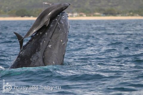 Невероятно! Дельфины и киты способны играть друг с другом. Учёные не раз наблюдали одно из таких взаимодействий между афалинами и горбатыми китами: обнаружив кита, дельфин подплывал и занимал положение над ним, влекомый создаваемой волной. Через некоторое время кит поднимался вверх, чтобы сделать вдох, заодно поднимая дельфина на своём носу. При этом кит выпрямлялся в нехарактерное для него вертикальное положение, после чего дельфин соскальзывал по его телу обратно в воду словно с горки.