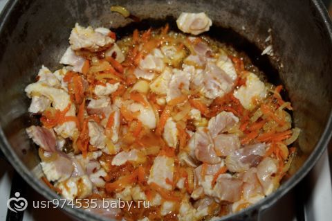 Итак, сначала пассируем лучок с морковкой до золотистого цвета, добавляем свининку, довольно мелко нарезанную