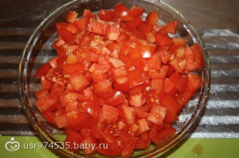 Пока готовится мяско, нарезаем кубиками помидорки,