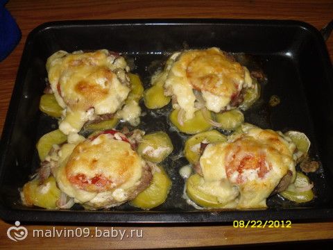 Выложить на него картофель, затем свинину, лук, помидор (кружочками), майонезом смазать каждый порционный кусок, посыпать сыром