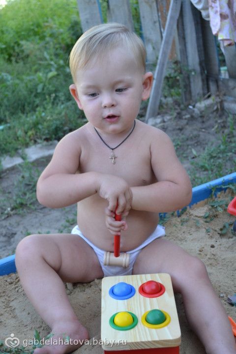 забыла! есть еще такая игрушка, типа столика маленького, в нем четыре отверстия для шариков, и молоточек. с помощью молоточка надо забить шарики, вот это нравится! нам на полтора года невеста наша подарила ))) мама, которой тоже бебирушечка )))))))