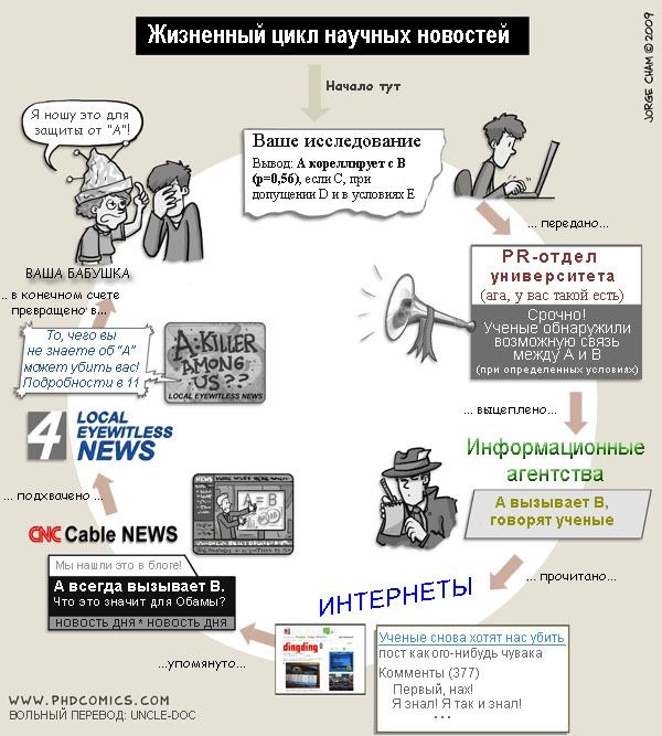 На прощание — небольшой комикс о том, во что превращаются научные новости, пока добираются до конечного потребителя.
