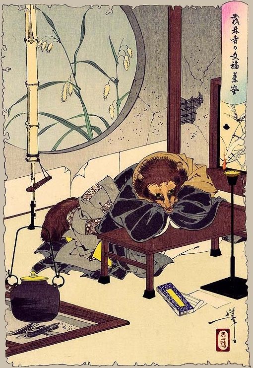 В компанию к кицунэ, еще один очаровательный оборотень — тануки или енотовидные собаки. Считается, что они приносят удачу, хотя далеко не все легенды про тануки столь оптимистичны. Кроме того, тануки могут превращаться как в людей, так и в различные предметы. Например, одна легенда повествует о монахе из храма Морин, который собирался поставить чайник на огонь, как вдруг у чайника выросли хвост и уши и он забегал по комнате. Разумеется, это был тануки. Монахи разрешили ему остаться в храме — именно этот тануки изображен на второй гравюре Yoshitoshi.
