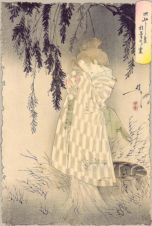 Для затравки — камень, плачущий по ночам. Согласно легенде, беременная женщина путешествовала в поисках своего пропавшего мужа. На дороге ей повстречался вор, который ограбил и убил бедняжку. Кровь ее попала на камень, ставший прибежищем для ее души. Каждую ночь он издывал жалобные звуки. На гравюре изображен тот момент, когда муж отыскал этот камень. Согласно этой версии легенды, привидение вернуло мужу ребенка и рассказало ему про убийство, а так же про то, что богиня милосердия Каннон спасла младенца и вскормила его сладостями. Призрак оставался рядом с мужем и помогал ему, пока тот не отомстил за смерть жены.