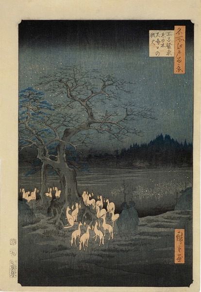 Изображены здесь, конечно же кицунэ, лисы-оборотни и их волшебные огни. Про них написано так много, что ничего добавить не могу, лучше просто процитирую Википедию: