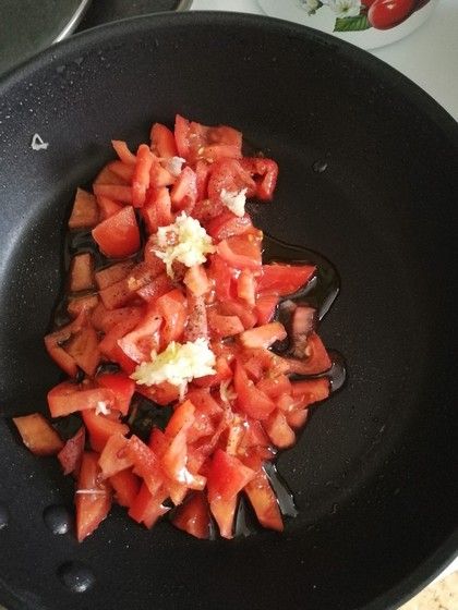 Помидоры порезать посолить поперчить добавить чеснок и пожарить в оливковом масле (ну пожарить это я конечно сильно)))) потушить)