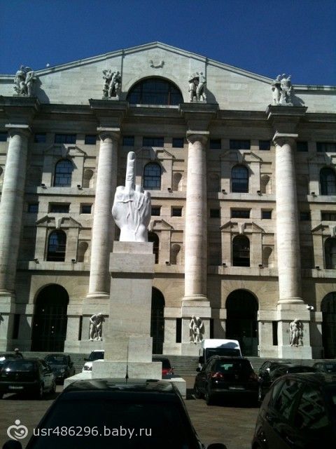 4-метровый мраморный кулак с поднятым вверх средним пальцем обращен к финансовым воротилам. Милан, Италия