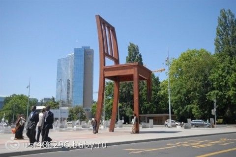 Памятник сломанному стулу словно напоминает, что агрессия против сотрудников ООН может обернуться не самым лучшим образом, и призывает к дипломатическим отношениям. Женева, Швейцария