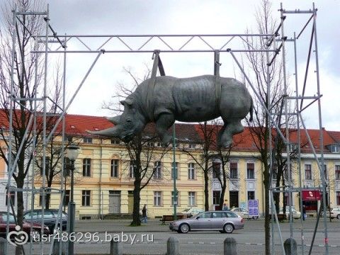 Скульптура висящего белого носорога. Потсдам, Германия