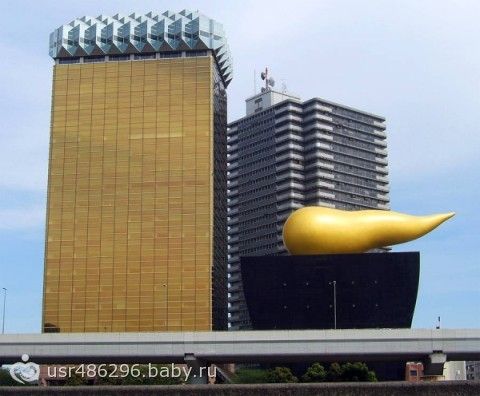 Здание-факел пивной компании Asahi скандально известно благодаря своему архитектурному изыску — таинственному золотому объекту. Одни считают, что это пламя, другие — что пенная шапка. Однако в народе эту штуковину давно окрестили «золотой какашкой». Токио, Япония