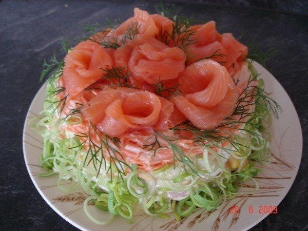 украшается салат по-разному, можно как на — фото резаным копченым лососем, скрученым в розочки, можно креветками с красной икрой и т.д, по бокам мелко в колечки нарезаный порей, или любой нарезаной зеленью (укроп, лук, петрушка)
