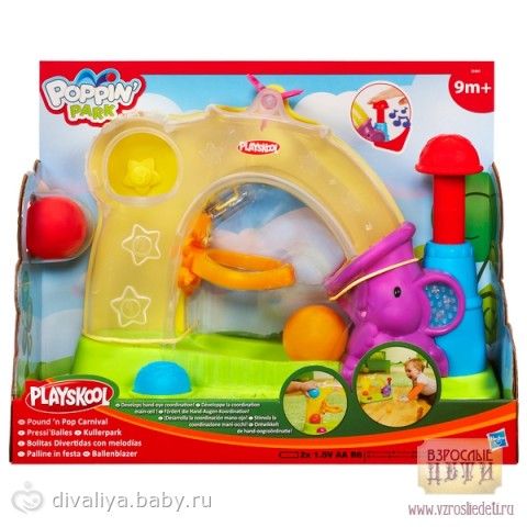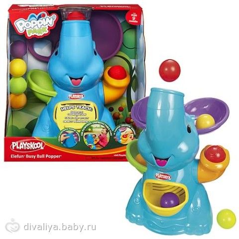 — Слон работает как пылесос только наоборот, выдувает шарики из носа и они либо катятся в через ухо и лапку в животик, либо обратно через другое ухо и влетают снова из носа. Дочке очень понравился постоянно к нему подходит поиграть.