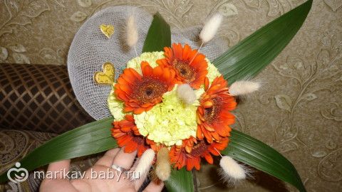 Девчонки, сегодня была в цветочном супермаркете — думала понаберу по три цветочка — попробую слождить в один красивый букет… а там все только по 20, да по 50 едениц… Вот взяла по самому малому количеству что продается. Гвоздика и гербера. Оцените. Что Вам не нравится? ну а что нравится — тоже скажите :)