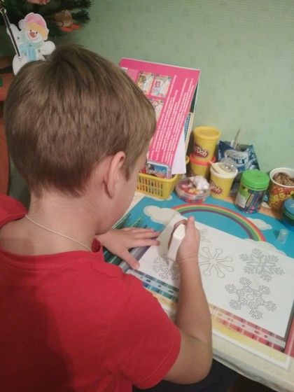 Потом ещё попробовали сделать «живые» снежинки. Нанес клей ПВА на рисунок в файле.