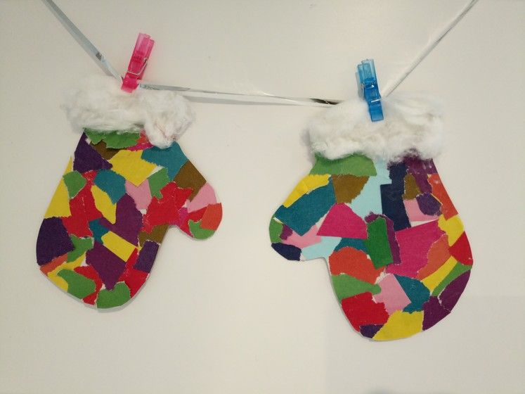 Поделку в стиле обрывной аппликации «Варежка Деда Мороза» дети делали практически сами. Я только вырезала им варежку по руке (от размера руки отступила примерно по 1см) и управляла процессом приклеивания кусочов цветной бумаги и ваты.