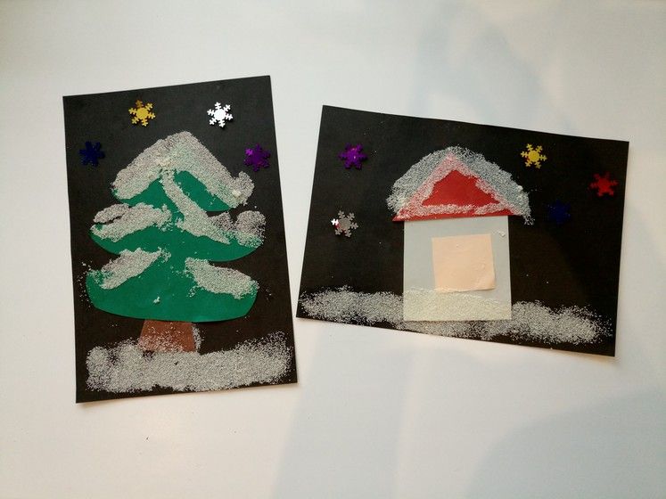 Вот и зима наступила! Наконец-то мы начали делать зимние поделки, что-то потом подарим дедушкам и бабушкам, что-то на память оставим. Детей хлебом не корми — дай чего-нибудь поклеить или полепить!? Особенно им нравятся поделки, в которых применяется любая крупа. Вот к примеру, в аппликации «Елочка» и «Дом» для изображения снега мы использовали манную крупу. Еще можно взять соль. Клеили на обычный клей-карандаш, для большего эффекта рекомендую взять клей ПВА. Снежинки лепили на кусочек пластилина.