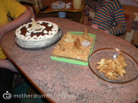 Это новогодний конкурс выпечки: торт от сына, торт от мамы, печеньки от девочек (изрядно поеденые и на елку развешеные)