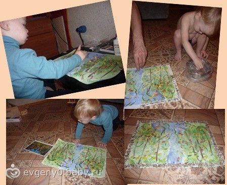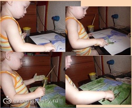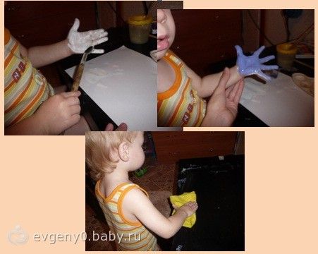 Пока сохла наша картина, мы играли с красками. Лешка попросил рисовать ладошками. Именно белой краской. Я подумала, что лучше быть не может! Как же он удивился, когда его ладошку почти не было видно на белом листе! Волшебство! Ставил еще несколько раз, пока я не объяснила что к чему. Потом решила показать, как получаются оттенки цветов. На белую ладошку мы нанесли густо синюю краску, получился голубой. Вначале Леша не очень понял, зачем тереть одну руку об другую? Но потом растер все до однородного цвета и стал просить еще. Вот такой спонтанный урок у нас получился, очень интересная игра для малыша! После помогал все прибрать.