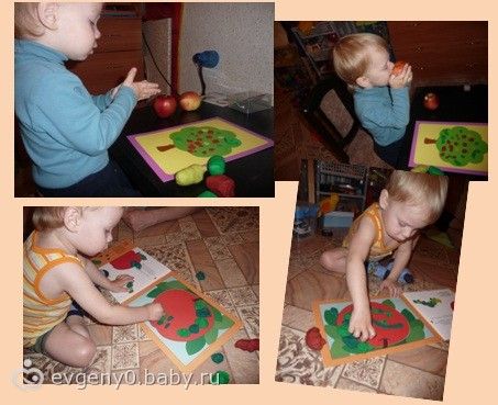 Еще мы лепили. Не обошли тему «Дары осени». Поговорили о том, что все созревает к осени, люди делают запасы, собирают урожай… Делали дерево с яблоками разных цветов, дегустировали яблоки. Лепили гусеницу, которая любит яблочки кушать! Лешка стал практически все лепить сам, даже кричит, что будет сам. Залепил все дерево яблоками почти без просветов к концу, а все яблоко гусеницами пока хватало пластилина! Но фотки выкладываю, сделанные где-то к середине процесса творчества, чтобы никого не пугать)))