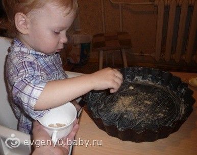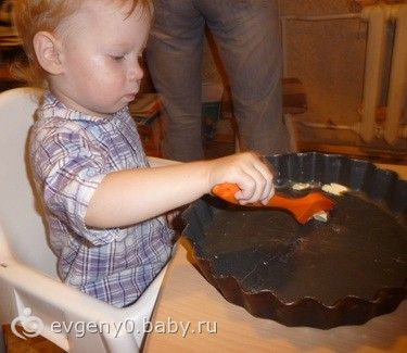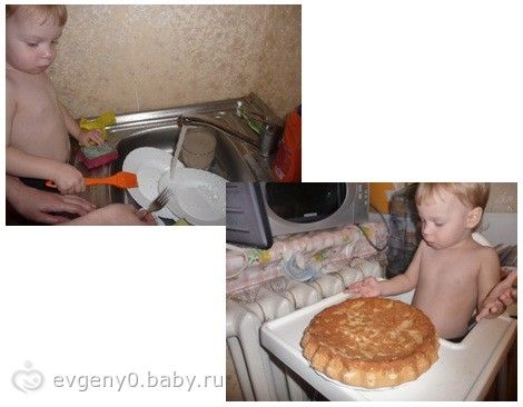 Затем залили яблочки и поставили в печку. Пока готовился наш пирог, мы с Лешкой мыли посуду.