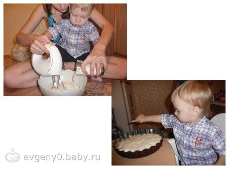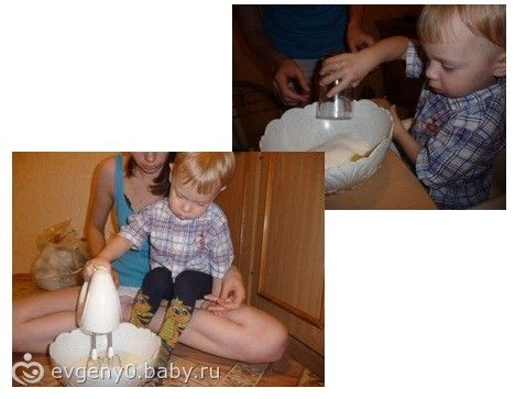 Потом принялись взбивать яйца с сахаром, добавили муку и разрыхлитель.