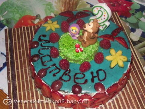 Коржи покупали бисквитные, можно и самим испечь, крем: 500 мл йогурта (мы брали классический 3,2%, без наполнителей), в йогурт 100 гр., сахара, эту массу взбиваем до полного растворения сахара(венчиком) и добавляем 125 мл., лимонного сока и взбиваем все это 20 минут. отдельно растворяем 20 гр. желатина (мы делали на стакан воды), желатин вливаем в смесь и хорошенько мешаем, отдельно взбиваем 400 гр жирных сливок со 100 гр. сахара, взбитые сливки соединяем с йогуртовой массой, перемешиваем деревянной лопаткой и ставим на 1,5-2 часа в холодильник! Когда ставишь крем в холодильник он жидкий, но застывает и получается нежное суфле, крем кисловатый, но за счет коржей и фруктов получается оооооочень вкусно! коржи пропитывали Амаретто(совсем чуть чуть) коржи смазывали кремом, и между ними тонко нарезанные фрукты (но это как хотите) мы клали банан и ананас! сверху заливали глазурью, покупали смесь готовую (доктор Ёоткер) и добавляли в глазурь пищевой краситель (то это опять же по желанию! Островок посыпали кокосовой стружкой зеленой, фигурки купили в кондитерской (в здании магазина СПАР), ну и украсили фруктами, как видно!!! Надпись делали кондитерскими карандашами, тоже в СПАРЕ продается, вроде всё!!!!
