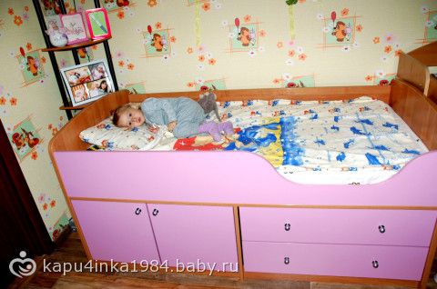 наша повыше фото, только у нас с лесенкой, а Кира давно в ней спит, не падает, не пытается сама ночью вылезти, мы сына только в 3,5 туда переложили и то первое время боялся высоты