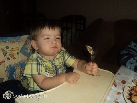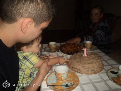 сегодня никаких особых празднований у нас нет, все будет в субботу: и стол, и куча гостей… На сегодня я испекла тортик, приходила бабушка мужа, посидели, попили чайку) Прабабушка Тима принесла пиццу собственного приготовления, он с удовольствием ковырялся там ложкой, боюсь, скатерти пришел песец))) но зато ребенок доволен