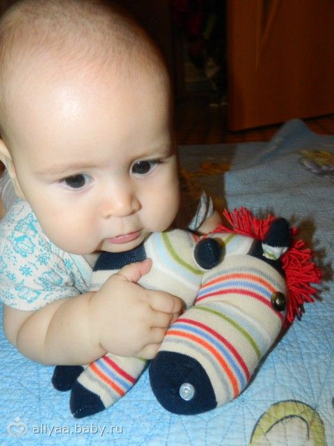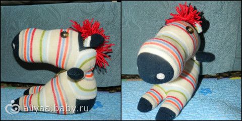Из носков, внутри холофайбер. В попе мешочек с горохом. Сыну понравился!