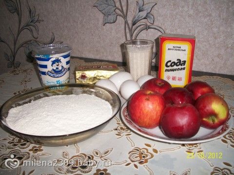 рецепт: маргарин сливочный 250 гр., сахар 300 гр., яйцо 4 шт., 1 ч. л. соды, 600-700- гр. муки, 0,5 кг. яблок, 1 стакан сметаны.