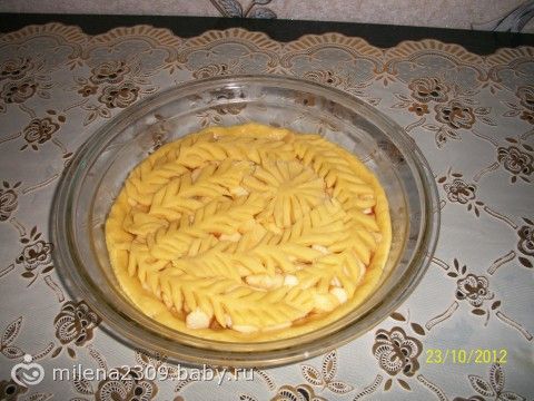 Берем 2/3 теста и выкладываем в форму, разминаем по дну, выкладываем сверху яблоки предварительно почищенные и порезанные тонкими ломтиками, из остального теста делаем узоры и выкладываем их сверху