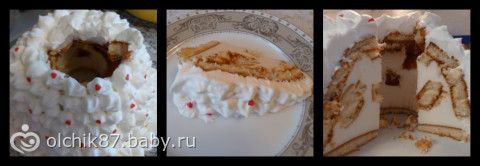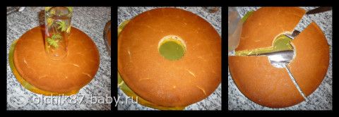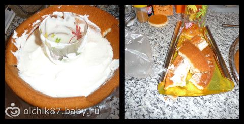 купила я пачку коржей бисквитных, вырезала в одном кружок по-серединке и разрезала его на клинья для юбки будущей
