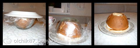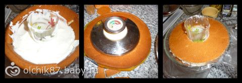 потом застелила салатницу целлофаном, поставила стакан и коржи вокруг него положила, обрезала чтоб плотненько было и крем туда потом выложила с обрезками коржа вперемешку