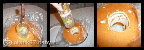 в миску крем выложила когда, то из второго коржа вырезала донышко для тортика, я крышкой надавила и все, в ней тоже стаканом дырку делаем и накрываем