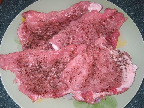 Мясо отбить молоточком с двух сторон, сильно отбивать не стоит, иначе мясо будет сухим, если куски получатся слишком большими то поделить их пополам.Натереть отбитое мясо с двух сторон чуть солью и перцем.