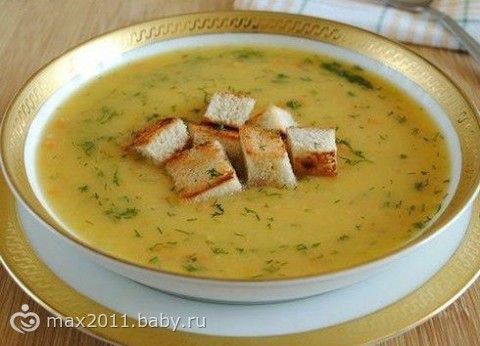 После того, как накипь убрана, можно добавить картофель, нарезанный на четвертинки, лук и морковь, тоже порезать на достаточно крупные кусочки. Довести до готовности. Дать немного остыть. Блендером аккуратно сделать пюреобразную массу. Суп готов. Подавать наш супчик с сухариками, сверху можно посыпать сыром, украсить веточкой петрушки или укропа.