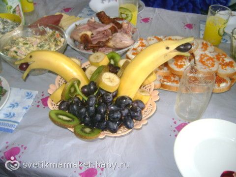 Фасоль и грибы обжариваем ( по отдельности!), остальное нарезаем соломкой все перемешиваем, добавляем майонез, соль и перец по вкусу. салат на фотке выглядет так( он слева от бананов стоит) заодно как можно украсить поднос с фруктами.