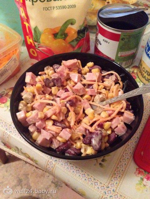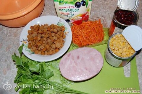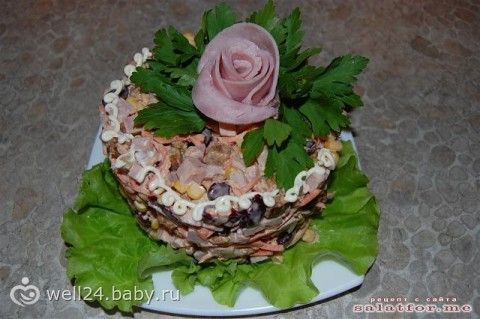 На днях у мамы ели похожий, только там ветчина палочками нарезана, шампиньоны обжаренные, консервированная фасоль, заправлен майонезом и украшен зеленью. Ну оч вкууусно! Муж до сих пор его каждый день вспоминает)) Думаю этот вариант тоже будет вкусным))